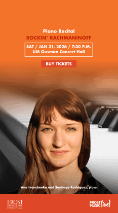 carta.fiu.edu/music In person and livestream Frost Symphonic Winds Robert Carnochan, conductor Gabrieli: Canzon septimi toni Dello Joio: Scenes from the Louvre S. Hanson: Elegy for Albinoni Susato: The Danserye 4 p.m. Gusman Concert Hall ci.ovationtix.com October 29 In person and livestream New World Percussion Consort Michael Linville, conductor Cage: Amores Tang: Impulse(s) Akiho: to wALk Or ruN in wEst harlem Cerrone: Don’t Look Down 7:30 p.m. New World Center nws.edu In person and livestream Frost Chamber Players Program TBA 7:30 p.m. Gusman Concert Hall ci.ovationtix.com FIU Music Festival Michael Eckroth, jazz pianist FIU Faculty Jazz Ensemble and Jazz Big Band Music by Gustav Holst, Cole Porter, Tom Garling and Rob Lussier, among others. 7:30 p.m. Wertheim Concert Hall carta.fiu.edu/music October 30 In person and livestream Frost Symphony Orchestra Gerard Schwarz, conductor Charles Castleman, violinist Watson: Four Textures for Orchestra Dvořák: Violin Concerto Mahler: Symphony No. 6 7:30 p.m. Gusman Concert Hall ci.ovationtix.com FIU Music Festival Amernet String Quartet and Friends Mozart: String Quartet TBA Ravel: String Quartet Enescu: Octet 7:30 p.m. Wertheim Concert Hall carta.fiu.edu/music November 5 FIU Music Festival & Friends of Chamber Music David Shifrin, clarinetist Asiye Korepanova, pianist Schumann: Fantasiestucke Brahms: Clarinet Sonata No. 2 Poulenc: Sonata for Clarinet and Piano Ravel: Ondine Debussy: Syrinx Debussy: Premiere Rhapsodie 7:30 p.m. Wertheim Concert Hall carta.fiu.edu/music